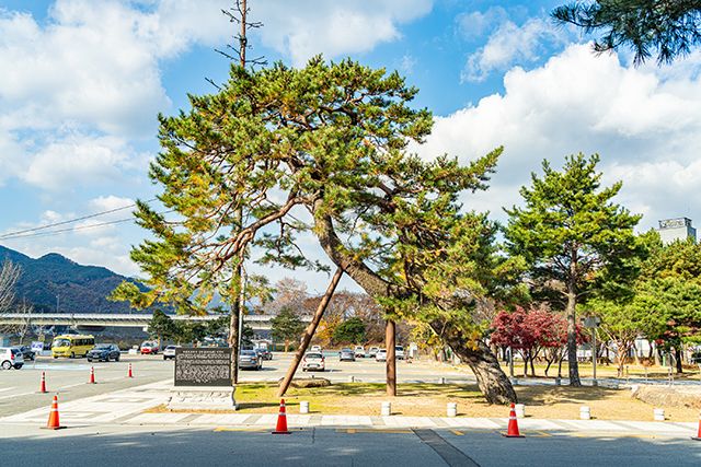 관리번호 1번목인 ‘맞이나무’가 기념비 뒤에서 오가는 이들에게 인사를 하는 듯이 줄기를 겸손하게 숙이고 있다. 그 건너편으로는 관리번호 2번목 ‘원앙나무’가 존재감을 과시한다. 바로 옆에서 씨앗을 틔운 뒤, 자라나며 하나가 된 연리목이다.