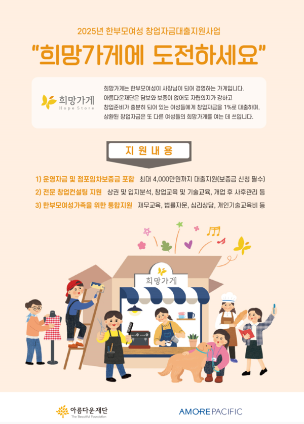 [포인트경제] 아모레퍼시픽이 아름다운재단과 함께 한부모 여성 창업대출 지원사업 ‘희망가게’의 창업주를 2월 1일부터 28일까지 공개 모집한다.