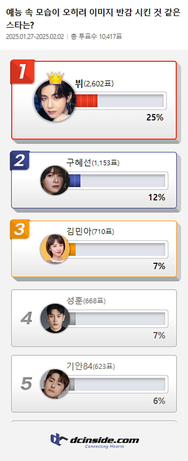 커뮤니티 포털사이트 디시인사이드가 `예능 속 모습이 오히려 이미지 반감 시킨 것 같은 스타는?`으로 투표를 한 결과 뷔가 1위에 올랐다. 이 투표는 1월 27일부터 2월 2일까지 총 7일간 진행했다.