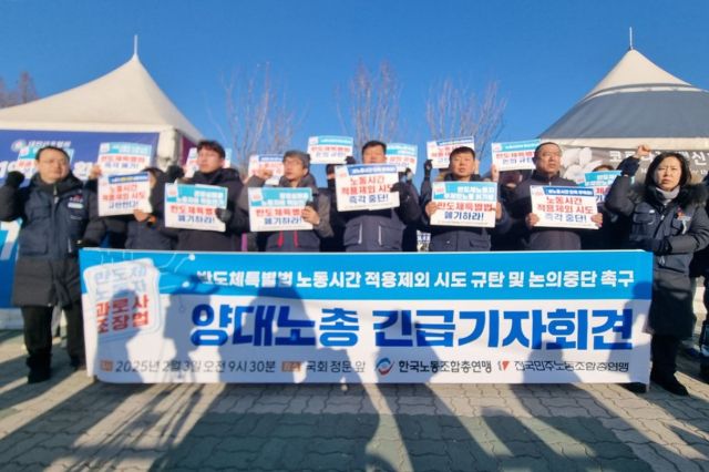 양대노총은 이날 서울 여의도 국회 앞에서 기자회견을 열고 같은 날 이 대표가 '반도체특별법 노동시간법 적용 제외 어떻게'를 주제로 한 당 정책토론회를 주재하는 점을 언급한 뒤 "구태의연하고 시대착오적인 노동시간 적용제외 도입 논의에 강력히 반대하며 동 법안을 비롯해 노동자를 장시간 노동의 구렁텅이에 몰아넣고 생명·안전을 내팽개치는 그 어떤 시도에도 총력 대응할 것"이라고 밝혔다.