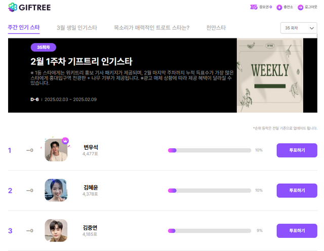 한편 2월 3일부터 진행되는 2월 1주 차 인기스타에서는 기사를 작성하는 현시점 기준으로 변우석이 4,477표로 1위를 차지하고 있으며 김혜윤이 4,378표로 2위, 김중연이 4,185표로 3위를 기록 중이다.