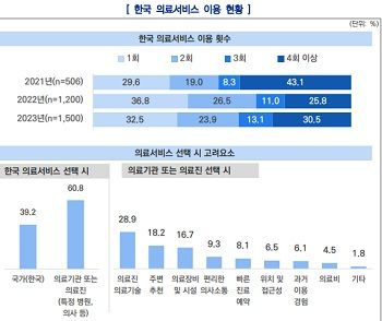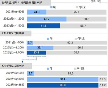 진흥원이 2023년 국내 의료기관에서 진료를 받은 외국인 환자 1,500명을 대상으로 한국 의료를 선택할 때 한국 문화 경험이 영향을 주었느냐는 질문에 응답자의 41.3%가 “그렇다.”라고 응답했다.