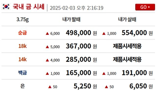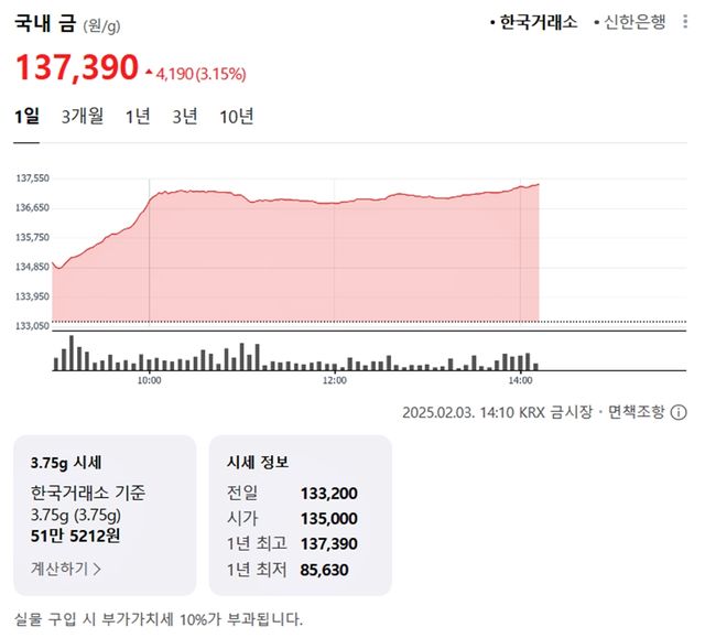 국내 금시세(금값)가 3일 오후 상승세(전 거래일 대비)를 보이고 있다.