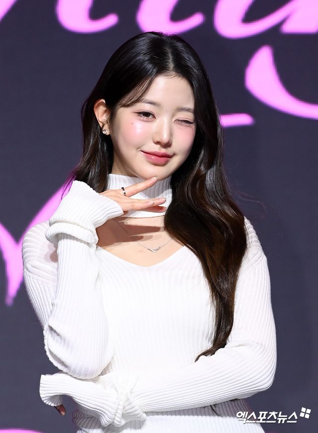 이날 기자간담회에 참석한 아이브 장원영이 포토타임을 갖고 있다.