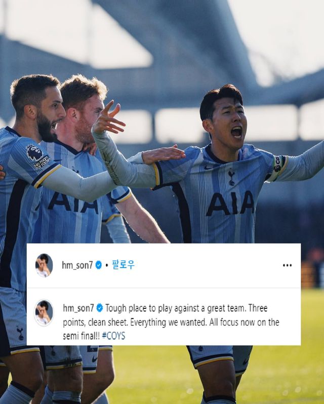 손흥민 역시 경기 뒤 기쁨을 드러냈다. 그는 3일 브렌트퍼드전이 끝난 뒤 자신의 소셜미디어(SNS)를 통해 “힘든 곳에서 훌륭한 팀을 상대로 경기했다. 승점 3점. 클린시트. 우리가 원한 모든 것을 얻었다. 이제 준결승에 집중해야 한다”고 적었다.