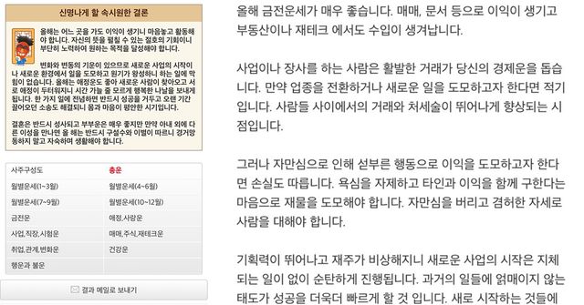 이외에도 '냉정하고 솔직한 쪽집게 감정', '후련한 토정비결', '출사표 비책', '타로 예지', '핵심 분석' 등 재미있게 점칠 수 있는 다양한 신년운세 서비스가 준비되어 있다.