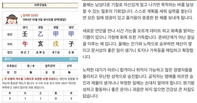 한편, 김대호는 한 유튜브 채널에서 차장급 연봉으로 약 1억 원을 받고 있다고 밝혔다. 이에 앞서 프리선언을 한 전현무는 연봉이 40억 원에 육박하는 것으로 전해져 김대호가 향후 이처럼 높은 수입을 올릴 수 있을지에 대한 관심이 집중되고 있는 가운데, 그의 올해 사주를 통해 재물운을 살펴보았다.