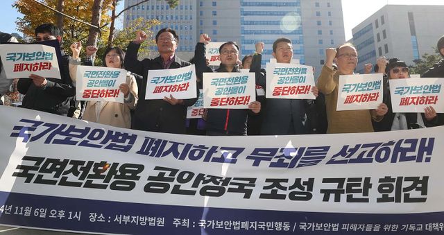 간첩 혐의를 받고 있는 민주노총 전직 간부의 1심 선고공판이 열린 2024년 11월 6일 경기 수원시 영통구 수원지방법원에서 민주노총 관계자들이 기자회견을 열고 국가보안법 폐지 및 국면전환용 공안정국 조성을 규탄하며 구호를 외치고 있다. / 뉴스1