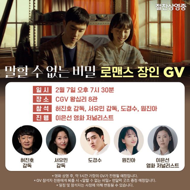 오는 2월 7일 오후 7시 30분 CGV 왕십리에서 허진호 감독, 도경수, 원진아, 서유민 감독과 함께하는 ‘로맨스 장인 GV’ 예매에 대한 자세한 사항은 CGV 홈페이지와 모바일 앱을 통해 확인할 수 있다.