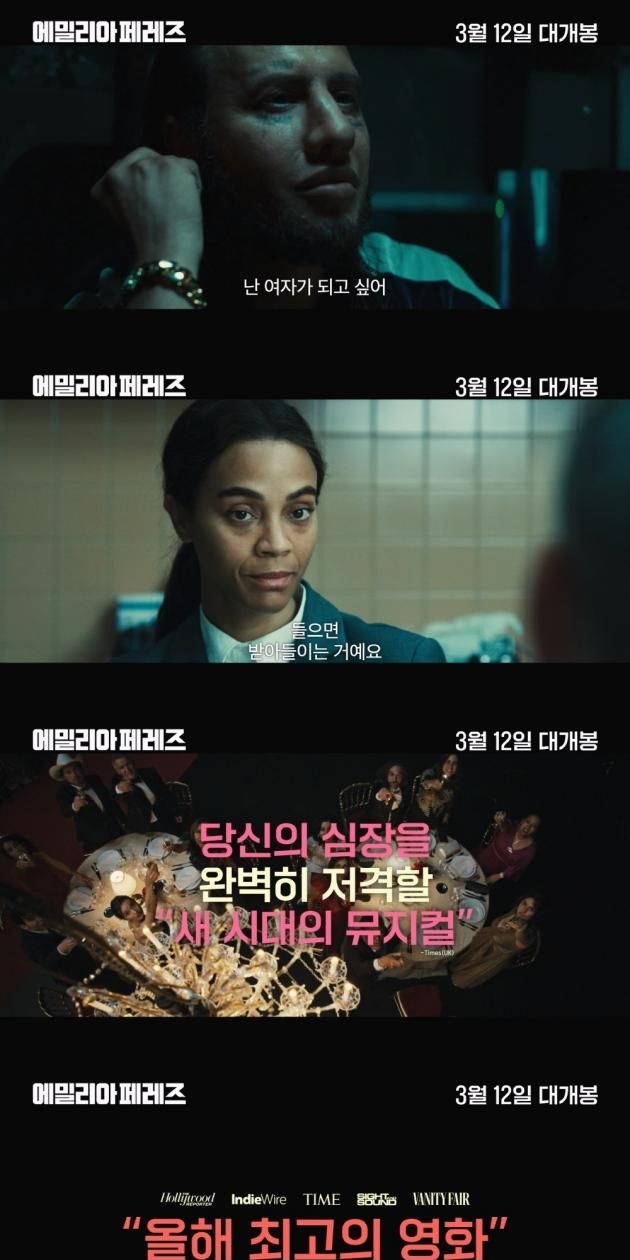 개봉일 확정과 동시에 공개된 '에밀리아 페레즈' 예고편은 주인공 리타(조 샐다나 분)가 의문의 여성 에밀리아(카를라 소피아 가스콘 분)를 만나고 갑자기 표정이 바뀌는 장면으로 시작한다. 이어 멕시코의 갱단 보스 '마니타스 델 몬테'의 성전환 수술을 돕기 위해 의사를 찾는 변호사 리타의 과거가 펼쳐지고, 황홀한 뮤지컬 음악에 맞춰 나오는 주인공들의 모습이 영화 속 이야기에 대한 기대를 최고조로 끌어올린다. 다시 첫 번째 장면의 장소로 돌아와 두 사람이 나누는 "당신이에요?" "빙고"라는 대화는 에밀리아의 정체가 바로 리타가 도왔던 갱단 보스라는 것을 암시하고 두 사람이 다시 만나게 된 이유가 무엇일지 궁금하게 만든다.