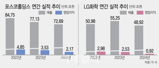 철강과 이차전지 사업을 주력으로 하는 포스코그룹의 상황도 여의치 않다. 그룹 지주사인 포스코홀딩스는 이날 지난해 연결기준 실적으로 매출은 전년 대비 5.8% 감소한 72조6880억원, 영업이익은 38.4% 줄어든 2조1740억원을 기록했다고 밝혔다. 철강 자회사 포스코는 전년 대비 3.6% 감소한 매출액 37조5600억원과 29.3% 줄어든 1조4700억원의 영업이익을 기록했다. 국내외 철강 수요 부진과 중국발 철강 공급과잉, 고로 개수 등으로 인한 생산·판매 감소 등이 수익에 악영향을 미쳤다.