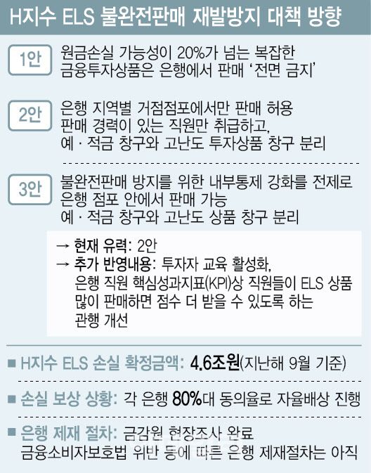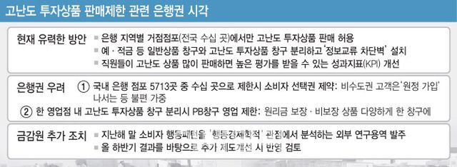 다른 은행 관계자는 “은행이 고난도 투자상품을 계속 취급하는 것도 투자하려는 고객의 수요가 있기 때문이다. 증권사에 가서 가입할 수도 있지만 은행 점포에서 가입하는 고객도 많다”며 “지방 영업점에서는 고객에게 ‘광역시 거점 점포로 가서 가입해달라’고 요청할 수도 있다”고 했다.