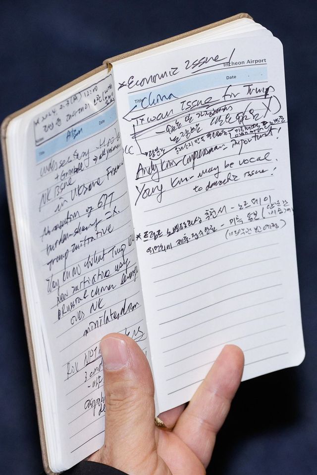 박선원 더불어민주당 의원이 3일 서울 여의도 국회 본회의장에서 열린 제422회 국회(임시회) 제1차 본회의에서 이재명 대표, 김민석 최고위원과 수첩에 적힌 메모를 보며 대화하고 있다. '트럼프 노벨평화상 추천서 - 노르웨이 위원회에 제출 접수 완료 - 미국 측 통보(백악관 보고 예정)'라고 적혀 있다. / 뉴스1