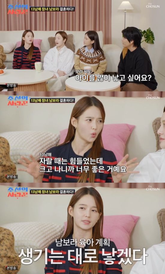 최성국은 "남편 될 분이랑 계획은 해봤냐"라며 물었고, 남보라는 "안 그래도 어제 이야기했다. 나는 너무 좋은 거 같다. 나도 다둥이었으면 좋겠다' 이랬는데 (예비 신랑이) '보라야. 사람이 집안에 많은 건 복이다. 이렇게 사람이 많기도 어렵고 많을 수도 없다. 생기는 대로 열심히 해보자' 이렇게 이야기를 했다"라며 고백했다.