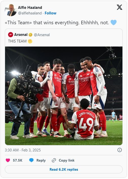 이에 아스널 공식 사회관계망서비스(SNS) 계정은 루이스-스켈리의 골 세리머니 사진과 함께 "이 팀(This Team)"이라는 글을 올렸고, 이에 대해 홀란 아버지 알피 홀란은 "이 팀이 모든 걸 다 이긴다고? 에, 아닌데"라며 불쾌한 반응을 보였다.
