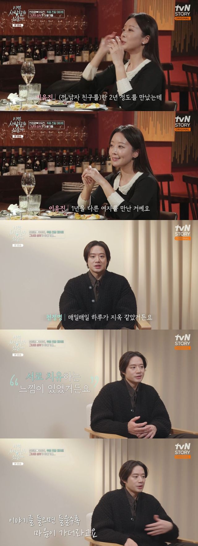 이야기를 들은 천정명은 "일단 극복하기가 힘들었다. 매일매일 하루가 지옥 같았다. 그 일을 당한 거 자체가 안 된 거다. 남자가 못됐다. 그 과정 자체가 서로 일이 있고 아픔이 있지만 치유받는 느낌이었다. 저도 공감대가 있었다. 안타까운 것도 있었지만 이야기 들을수록 마음이 가더라"라며 자신의 아픔을 떠올리게 하는 이유진의 경험에 대해 언급했다.