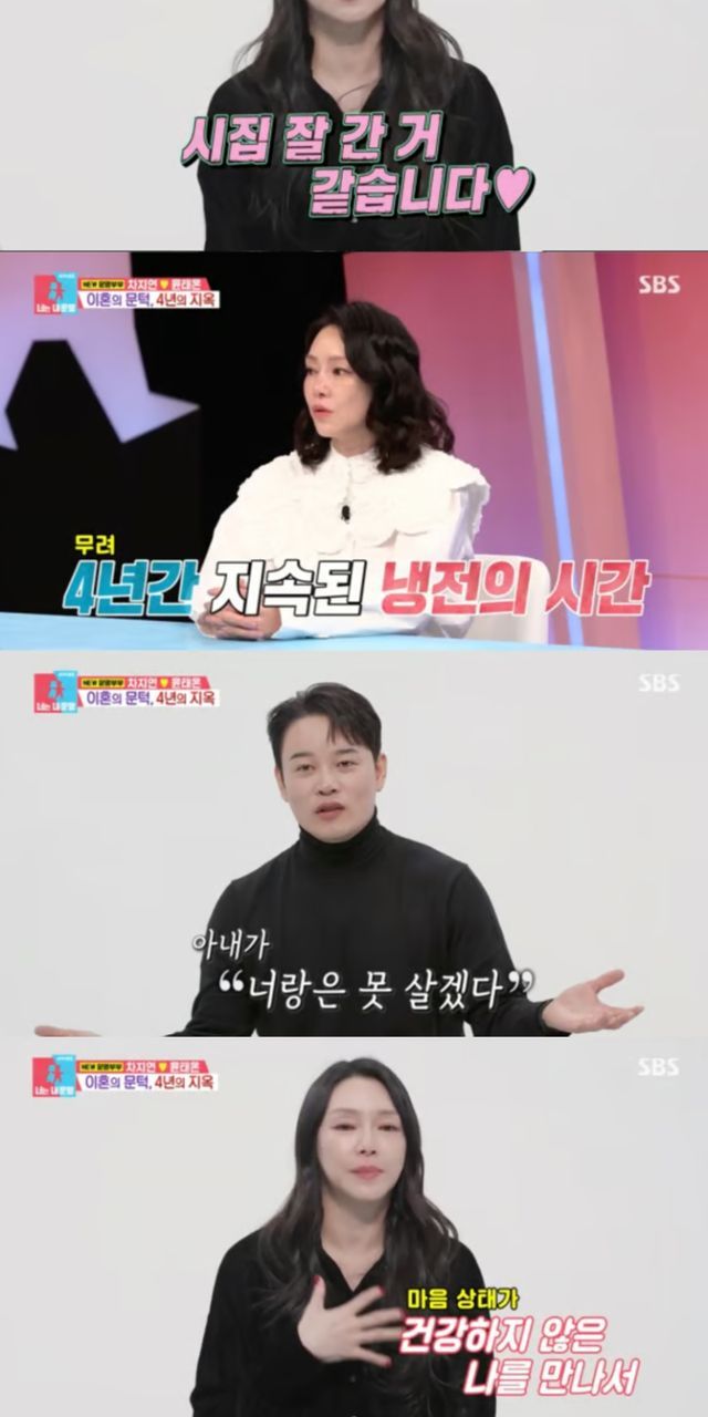 이런 상황 속에서 두 사람의 냉전은 4년간 지속됐고, 결국 차지연이 이혼을 요구하기도 했다는 사실도 공개했다. 차지연은 “이혼을 앞두고 ‘더블 캐스팅’이라는 오디션 프로그램에 저는 심사위원으로, 남편은 참가자로 출연했다. 그때 남편이 무대 위에 올라오는데 기분이 너무 이상했다. 사랑하는 감정, 미운 감정 다 들었는데 그때 굉장히 괴롭고 미안했다”고 회상했다.