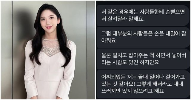 네티즌이 공개한 사진에는 오요안나와 네티즌이 나눈 대화 내용을 캡처한 모습이 담겨 있었다. 오요안나는 "저 같은 경우에는 사람들한테 손 뻗으면서 살려 달라 말한다. 그럼 대부분의 사람들은 손을 내밀어 잡아준다. 물론 밀치고 잡아주는 척하면서 놓아버리는 사람도 있긴 하다"라며 "어찌 됐든 저는 끝내 일어나 걸어가고 있는 것 같다. 그렇게 해서라도 내내 쓰러져만 있지 않으려고 한다"라고 말했다.