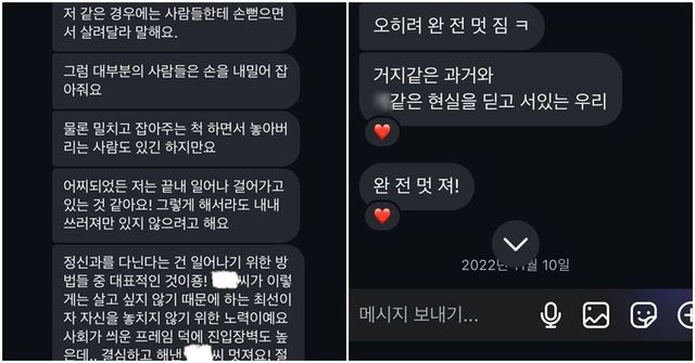 이어 "정신과를 다닌다는 건 일어나기 위한 방법 중 대표적인 것이다. OO 씨가 이렇게는 살고 싶지 않기 때문에 하는 최선이자 자신을 놓치지 않기 위한 노력이다. 사회가 씌운 프레임 덕에 진입 장벽도 높은데 결심하고 해낸 OO 씨 멋지다. 절대 창피한 일 아니다"라고 위로했다.