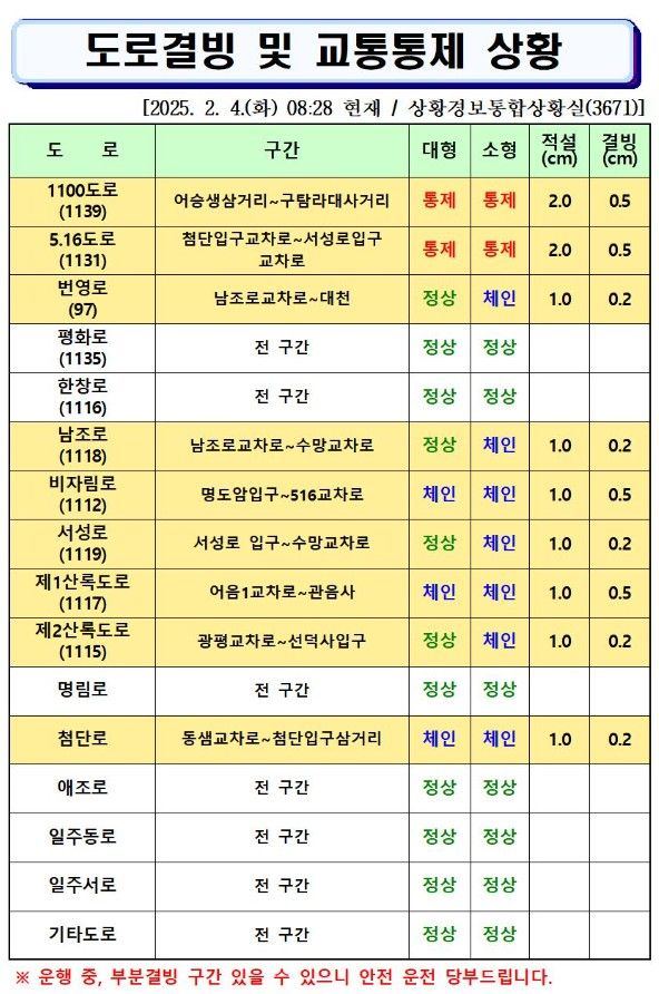 제주특별자치도와 제주경찰청에 따르면 4일 오전 8시28분을 기준으로 ▷1100도로(1139) 어승생삼거리~옛 탐라대사거리 ▷5·16도로(1131) 제주첨단과학단지 입구 교차로~서성로 입구 교차로가 대형·소형 모두 전면 통제되고 있다. 0.2~0.5㎝의 결빙구간과 1.0~2.0㎝의 적설량을 보이고 있다.