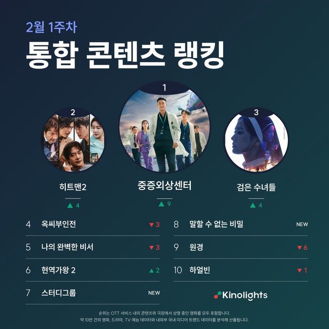 OTT 콘텐츠 통합 검색 플랫폼 키노라이츠가 4일 발표한 2월 1주 차(1월 27일~2월 2일) 통합 콘텐츠 랭킹에서 넷플릭스 오리지널 시리즈 '중증외상센터'가 공개 이후 처음으로 1위를 차지하며 뜨거운 관심을 받고 있다.