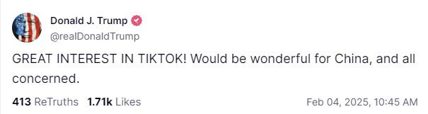 앞서 트럼프 대통령은 이날 국부펀드 조성을 지시하는 행정명령에 서명한 뒤 틱톡의 미국 내 사업권을 인수할 수 있다고 시사했다. 그는 “우리는 틱톡과 함께 뭔가를 할 것”이라며 “우리는 올바른 거래를 한다면 할 것이다. 그렇지 않으면 우리는 틱톡을 국부펀드에 넣을 수도 있다”고 말했다. 트럼프 대통령은 틱톡의 미국 내 사업을 허용하되 지분 50%를 미국 측에 넘기는 방안을 제시한 바 있다.