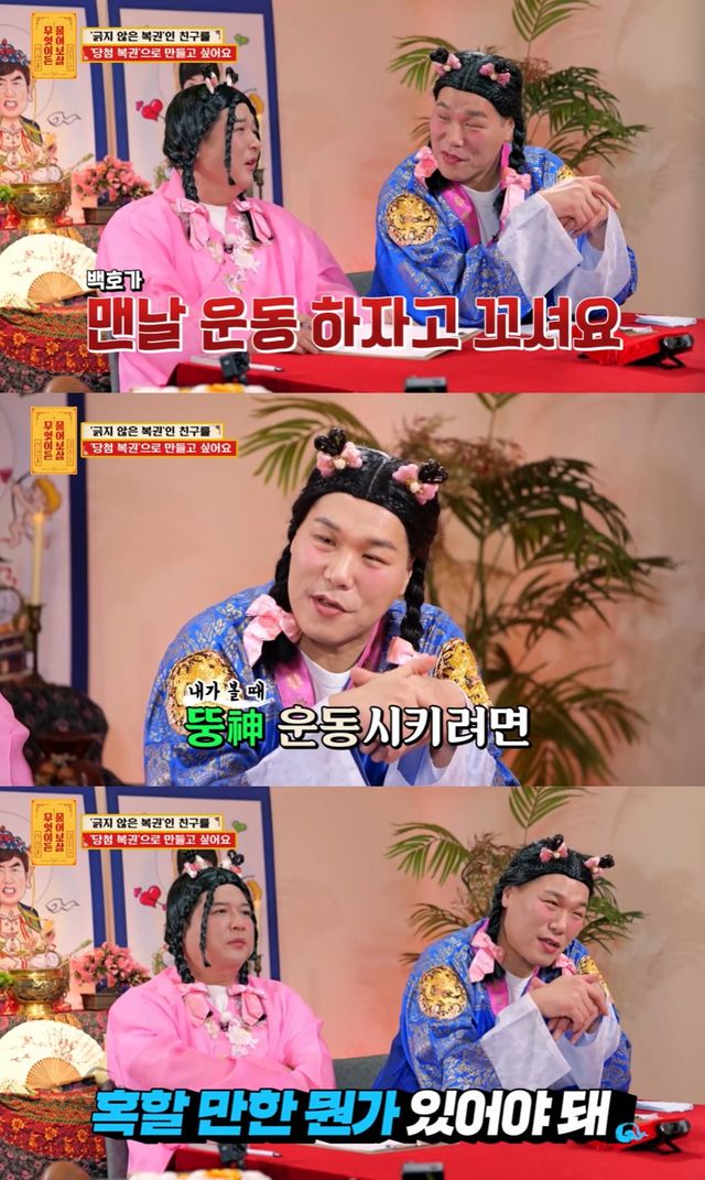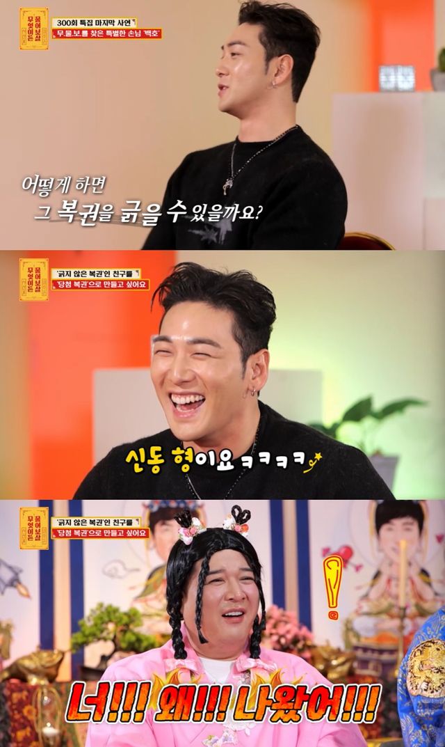 이날 백호는 보살 서장훈과 신동에게 '긁지 않은 복권인 친한 친구를 당첨 복권으로 만들고 싶다'고 상담했다. 그는 "친한친구가 관리가 더 잘되면 멋있을 거 같아 상담하게 됐다"면서 "그 친구는 신동 형"이라고 말했다.