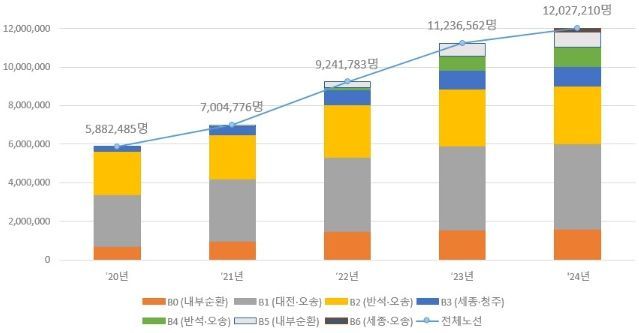 분석 결과, 2024년 노선별 연간 이용객 비중은 B1(대전~오송)이 36.6%, B2(반석~정부청사~오송)이 25.0%, B0(내부순환)이 13.3%로 3개 노선의 이용 비중이 75%에 달하는 것으로 나타났다.