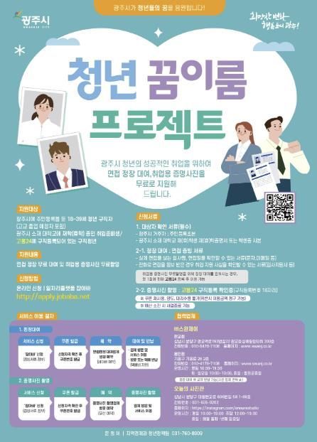 이 사업은 광주시에 거주하거나 광주시 소재 대학에 재(휴)학 중인 18세~39세 청년 구직자를 대상으로 면접 정장 무료 대여 및 증명사진 무료 촬영을 지원하는 프로그램이다.