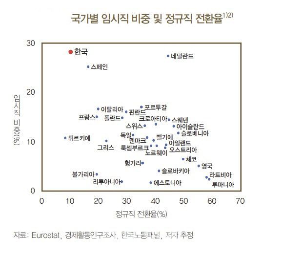 채 과장은 “비정규직의 정규직 전환 관련 제도 개선, 중소기업의 교육·훈련 프로그램 확충 지원 등을 고려해볼 수 있다”며 “현 제도하에서는 정규직으로 전환하는 순간 해당 직원에 대한 해고 비용 등이 급증하기 때문에 기업이 전환을 꺼리게 되므로, 정규직-비정규직 간 해고 비용 격차를 줄일 필요가 있다”고 했다.