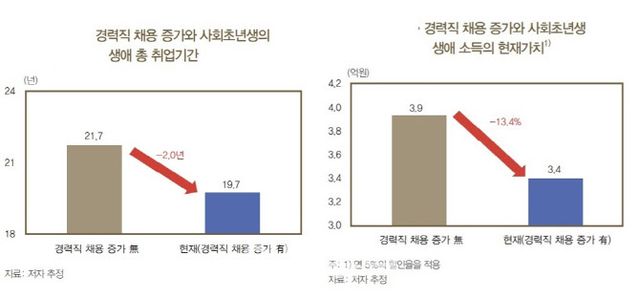 보고서에 따르면 첫 취업이 늦어지면서 생애 총 취업 기간은 평균 21.7년에서 19.7년으로 2년 줄어들고, 이에 따라 노동시장 진입 시점에서 기대할 수 있는 평생 소득도 3억 9000만원에서 3억 4000만원으로 13% 하락했다.