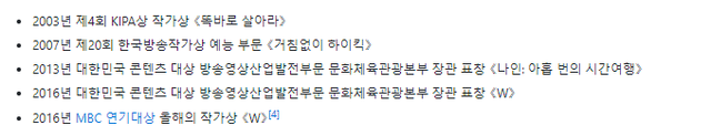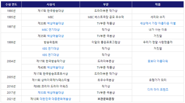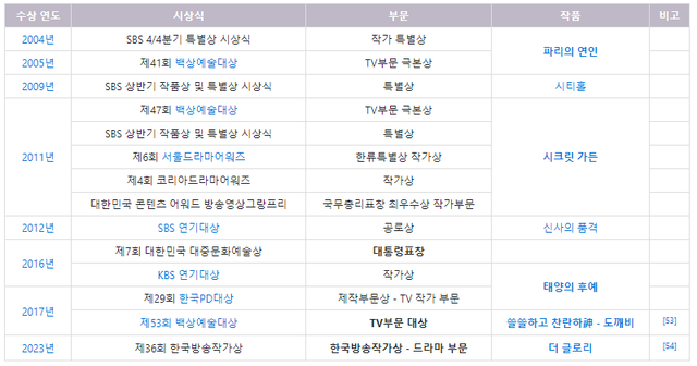 2011년 ‘시크릿 가든’으로 백상예술대상, 서울드라마어워즈, 코리아드라마어워즈 작가상 그랜드슬램
