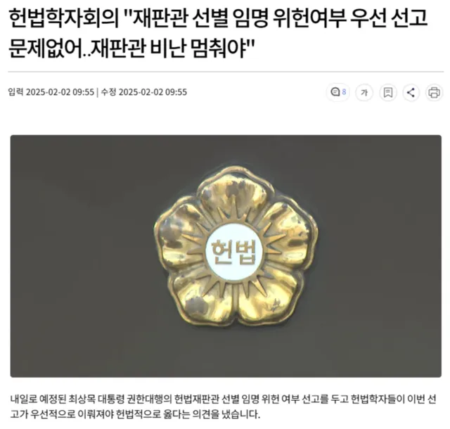 헌법학자회의 "재판관 선별 임명 위헌여부 우선 선고 문제없어.. 재판관 비난 멈춰야"