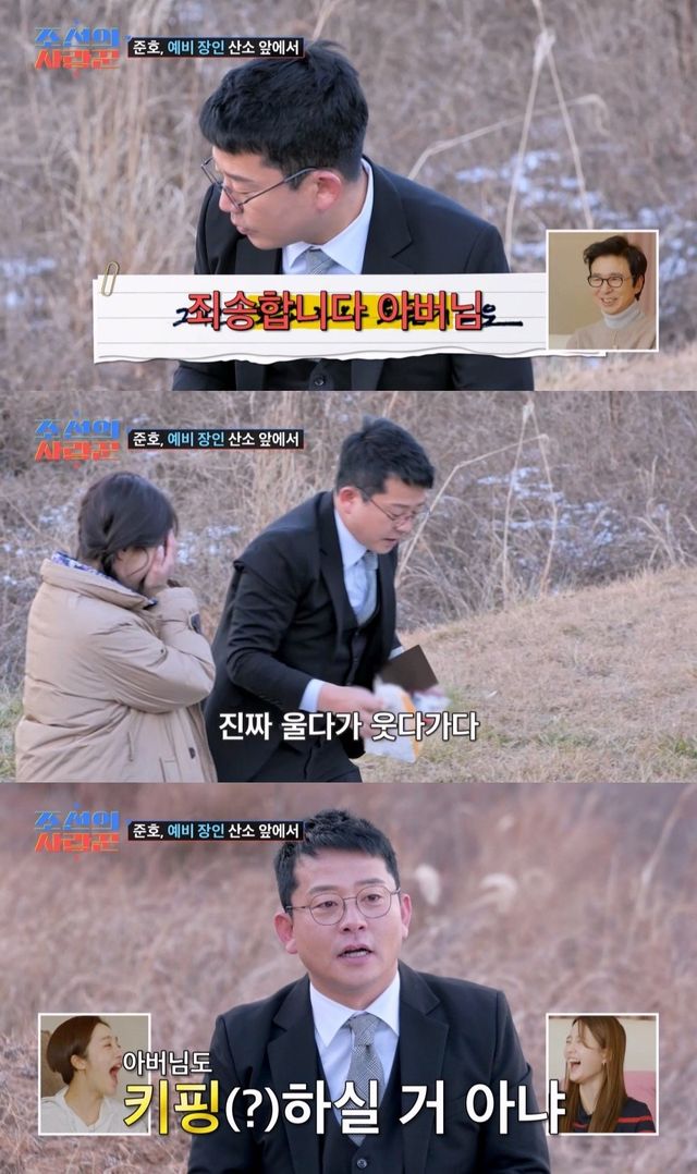 김준호가 예비 장인을 위해 100만 원 상당의 고급 양주를 따며 밝아진 분위기는 김지민이 절을 하다 오열하면서 반전됐다.