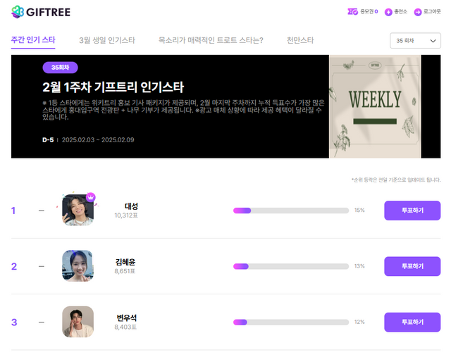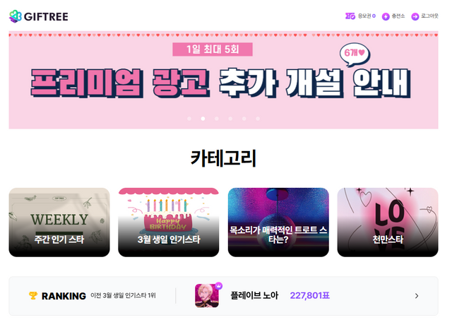 주간 인기 스타 화면 / 기프트리