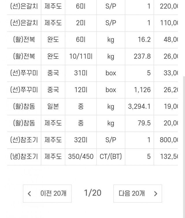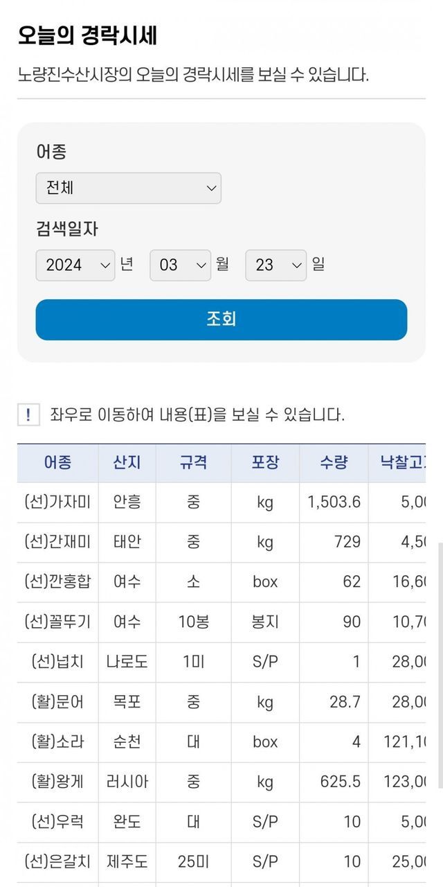 노량진 수산시장 사이트 가면 그낭 경매 낙찰가가 쫙 뜸