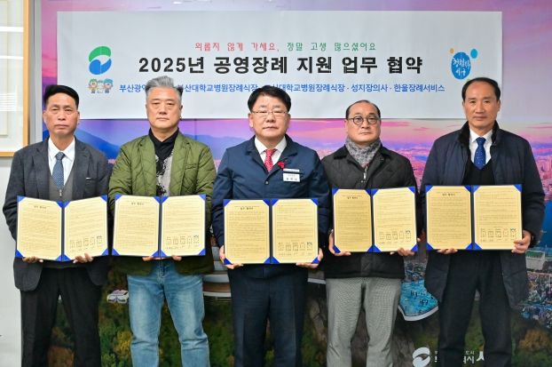 [파이낸셜경제=김예빈 기자] 부산 서구는 지난 4일 부산대학교병원 장례식장, 고신대학교복음병원 장례식장, 성지장의사, 한울 장례 서비스와 『2025년 공영 장례 지원사업』 업무협약을 체결했다.