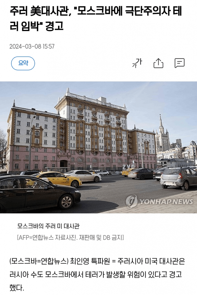 2주 전에 이미 미국 대사관에서 모스크바에서 극단주의자에 의한 테러 예고했음