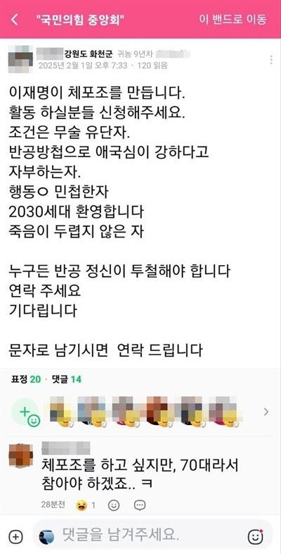 양 의원이 공개한 네이버 밴드 ‘국민의힘 중앙회’는 이날 기준 2만 7000여명이 가입된 SNS다. 이 밴드에는 “이재명 체포조를 만든다”며 “활동하실 분 신청해 주시라. 조건은 무술 유단자, 반공방첩으로 애국심이 강하다고 자부하는 자. 행동이 민첩한 자. 2030세대 환영한다”고 적힌 글이 올라왔다.