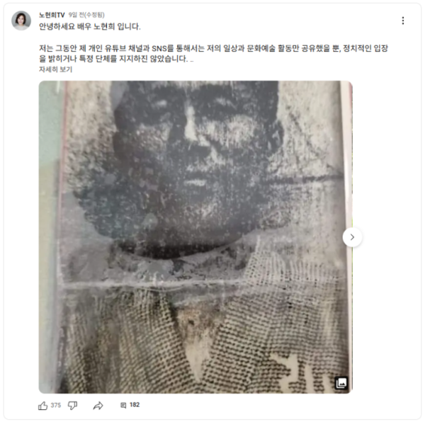 노현희는 "나는 보수의 가치를 존중하는 합리적 보수주의자로서 자유민주주의 수호를 위해 거리로 나섰다"며 "집회에서 우연히 만난 동료 배우의 유튜브 라이브 방송에서 밤새 고생하는 2030 세대를 응원하며 '함께 좋은 결과를 기도드린다'고 말한 것이 논란이 된 것 같다"고 설명했다.