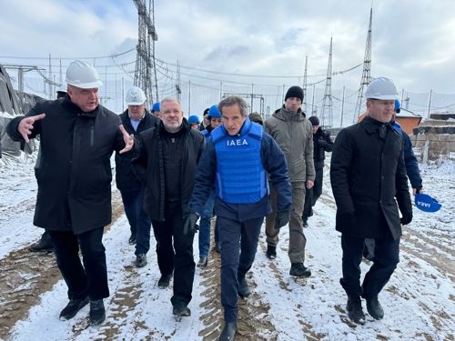 epa11874322 A handout photo made available by the International Atomic Energy Agency (IAEA) shows IAEA Director General Rafael Grossi (C) visiting the Kyivska substation, near Kyiv, Ukraine, 04 February 2025. Grossi visited the Kyivska substation as part of ongoing efforts of the International Atomic Energy Agency to assist Ukraine in ensuring nuclear safety and security. He was accompanied by Ukrainian Energy Minister Herman Galushchenko and Energoatom Chairman Petro Kotin. This was Grossi's 11th visit to Ukraine since the beginning of the conflict in February 2022.