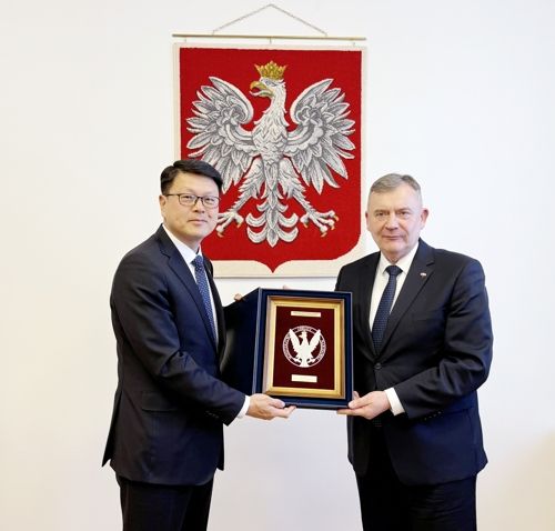 방위사업청 조현기 기반전력사업본부장이 지난달 20일(현지시간) 폴란드 국방부에서 파베우 베이다 국방차관과 면담 후 기념촬영을 하고 있다.