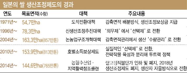 일본의 쌀 생산조정제도도 도입 당시 농민들의 반발이 컸다. 생산감소로 소득이 줄 것이라는 게 큰 걱정거리였다. 정책 시행 초기인 1971년, 일본 정부는 논 면적의 20%(55만㏊) 감축을 목표로 했다. 그러나 감축 목표를 달성해도 농업 기술의 발전·품종·재배환경 개선 등으로 단위 면적당 수확량(단수)이 늘어 과잉생산을 초래하는 문제가 빈발했다.