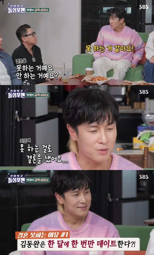 이날 방송에서 김동완은 "결혼을 안 하는 거냐 못 하는 거냐"는 질문에 "안한 게 아니라 못한 것"이라고 답했다. 이내 "결혼 빼고 다른 건 다 해봤다. '나는 결혼을 못하는 것'이라고 최근 결론을 내렸다"고 털어놨다.