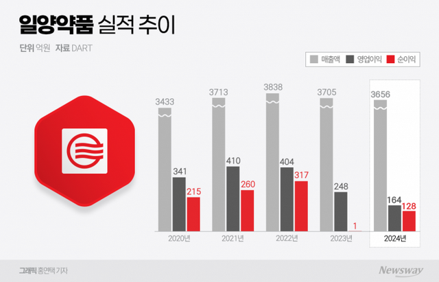 5일 제약업계에 따르면 일양약품은 지난해 연결 기준 순이익이 128억원으로 전년 동기(1억원) 대비 1만1325.7% 증가한 것으로 잠정 집계됐다고 지난달 31일 공시했다. 같은 기간 매출은 3656억원으로 1.3% 줄고 영업이익은 164억원으로 33.8% 감소했다.