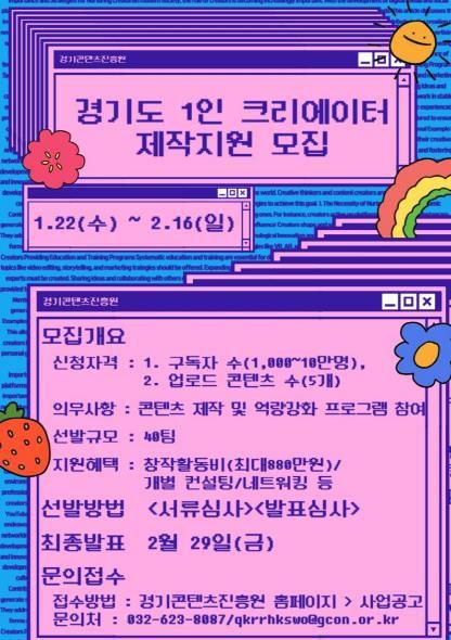 2017년부터 시작된 경기도 1인 크리에이터 지원 사업은 경기도를 기반으로 활동하는 구독자 1천 명 이상 10만 명 이하 채널을 보유한 크리에이터를 대상으로 한다. 최근 3개월간 직접 기획·제작해 게시 완료한 동영상 콘텐츠가 5개 이상이면 신청할 수 있다.