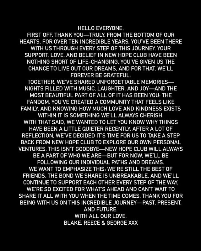 4일(현지시간) 뉴 호프 클럽의 리스 비비, 조지 스미스, 블레이크 리차드슨은 밴드의 공식 SNS 채널을 통해 감사 인사를 전한 뒤 "조용했던 최근의 이유를 여러분께 말씀드리고자 한다. 깊은 고민 끝에, 우리는 각자의 길을 탐색하기 위해 잠시 뉴 호프 클럽에서 한 걸음 물러나기로 결정했다"고 전했다.