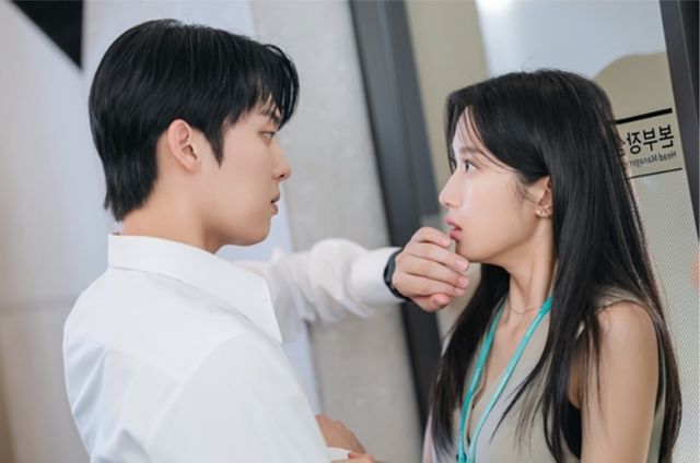 이 가운데 문가영과 최현욱의 ‘착붙 직장 모멘트’를 담은 투샷이 공개돼 이목을 집중시킨다. 공개된 스틸 속 두 사람은 무언가를 보고 깜짝 놀라 눈을 동그랗게 뜨고 있는데 똑 닮은 표정이 보는 이들의 미소를 자아낸다. 그런가 하면 서로의 숨소리가 들릴 정도로 얼굴을 가까이 마주한 문가영과 최현욱의 모습은 아슬아슬한 텐션을 자아내며 심박수를 상승시킨다. 이어진 스틸 속 퇴근 후 나란히 서있는 문가영과 최현욱은 서로를 의식하는 듯 묘한 기류를 형성해 설렘을 자극한다.