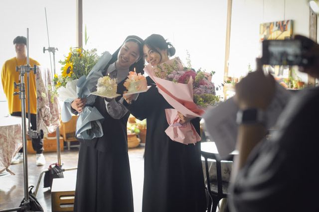특히 영화에서는 볼 수 없었던 ‘유니아’ 역 송혜교와 ‘미카엘라’ 역 전여빈의 특별한 케미는 보기만 해도 미소 짓게 하며 색다른 흥미를 유발한다. 뿐만 아니라 ‘바오로’ 역 이진욱과 ‘희준’ 역 문우진이 꽃다발을 들고 있는 스틸과, ‘애동’ 역 신재휘가 다른 배우들과 함께 자동차 안에서 함께 포즈를 취한 스틸 등은 훈훈한 현장 분위기를 예상케 하며 영화 팬들의 이목을 집중시킨다. 이처럼 영화를 완성한 주역들의 유쾌한 비하인드 스틸을 공개하며 N차 관람 열기를 더하고 있는 영화 ‘검은 수녀들’은 깊은 여운을 선사하는 이야기로 관객들을 매료하고 있다.