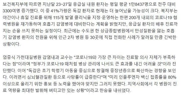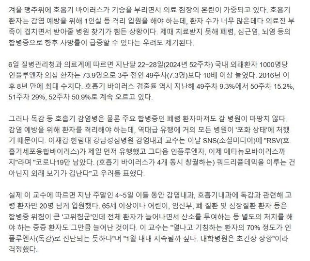 독감 외래 환자가 급증 하고 있다고함 1월 내내 지속될 듯 대학병원은 초긴장 상황이라고
